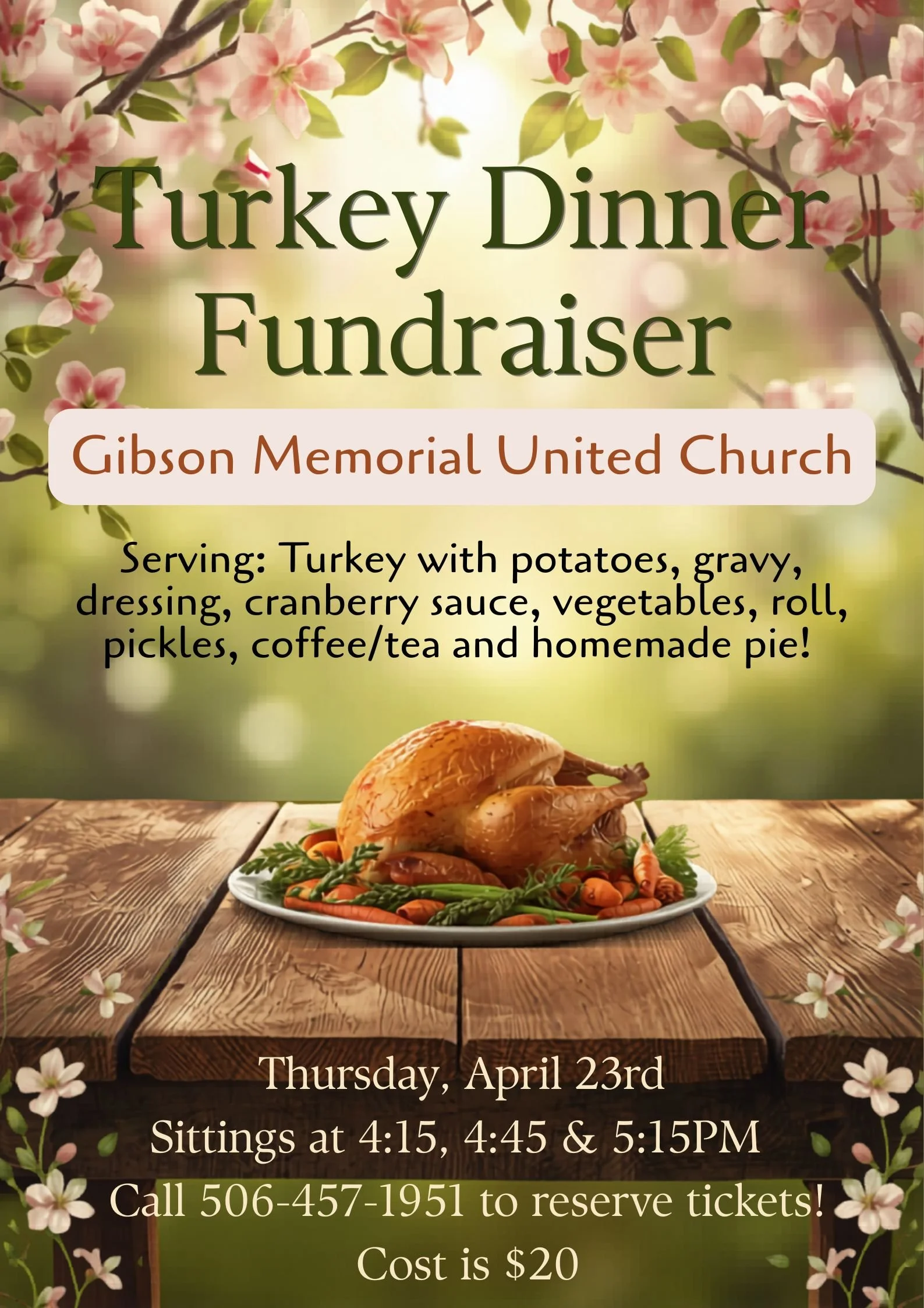 Tickets are $20 per person and reservations can be made. Please call 506-457-1951. Everyone is warmly welcome to come and enjoy a wonderful meal and community time together.