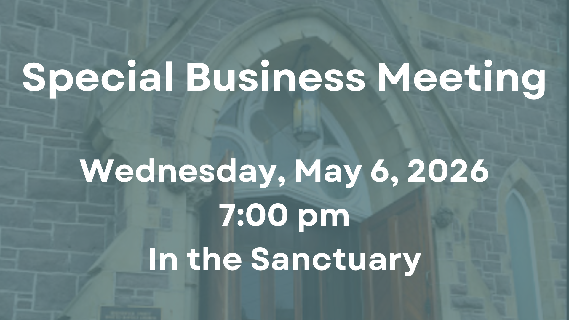 Upon the recommendation of the Board of Deacons, the moderator is calling for a Special Business Meeting to be held Wednesday, May 6 at 7:00 pm in the Sanctuary.